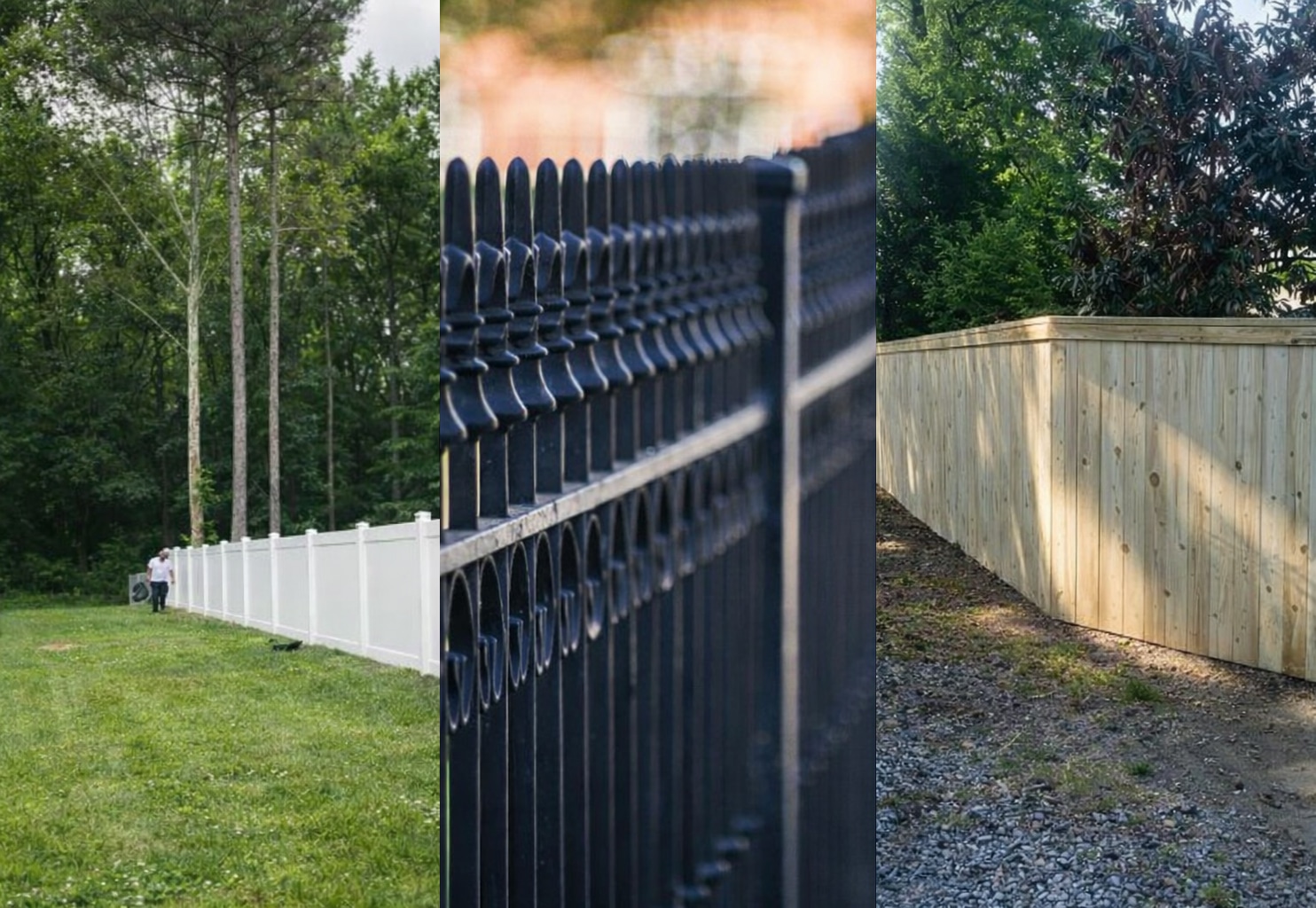 Wood works well for privacy and natural settings. Vinyl and aluminum provide low maintenance and clean boundaries.